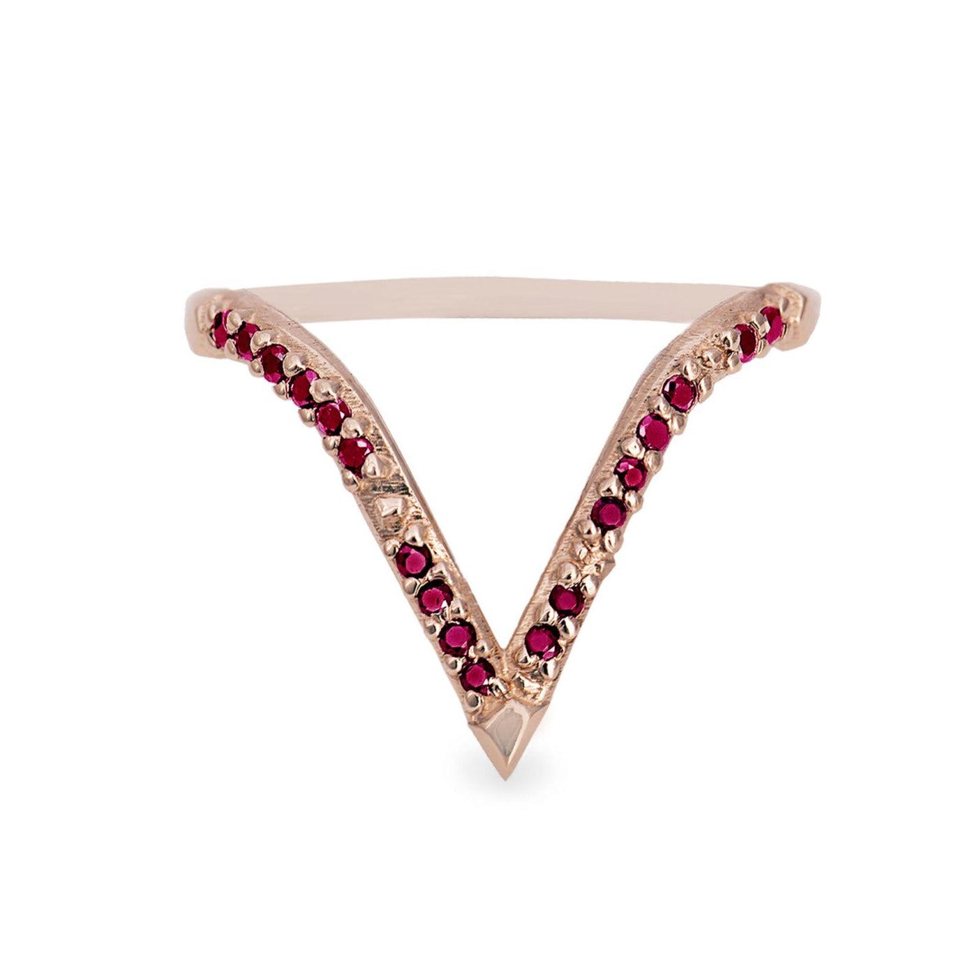 Eighteen tiny rubies are studded into a "V" shaped ring, forming a mountain-like ridge that rises atop the finger. Peak offers a sophisticated complement to your current stack and also look brilliant on its own.