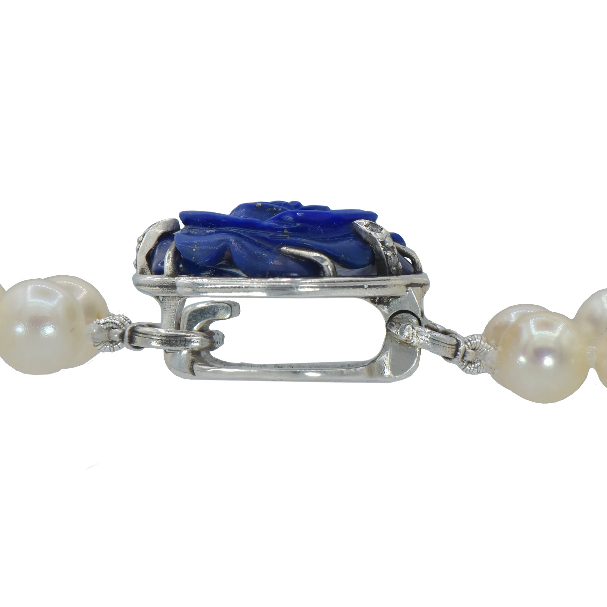 CLIENT REQUEST: Transform inherited double strand pearl necklaces with this custom centerpiece clasp, featuring a carved lapis rose secured with diamond-studded claws.