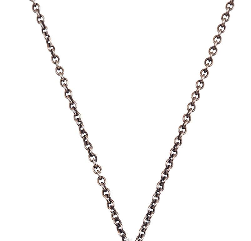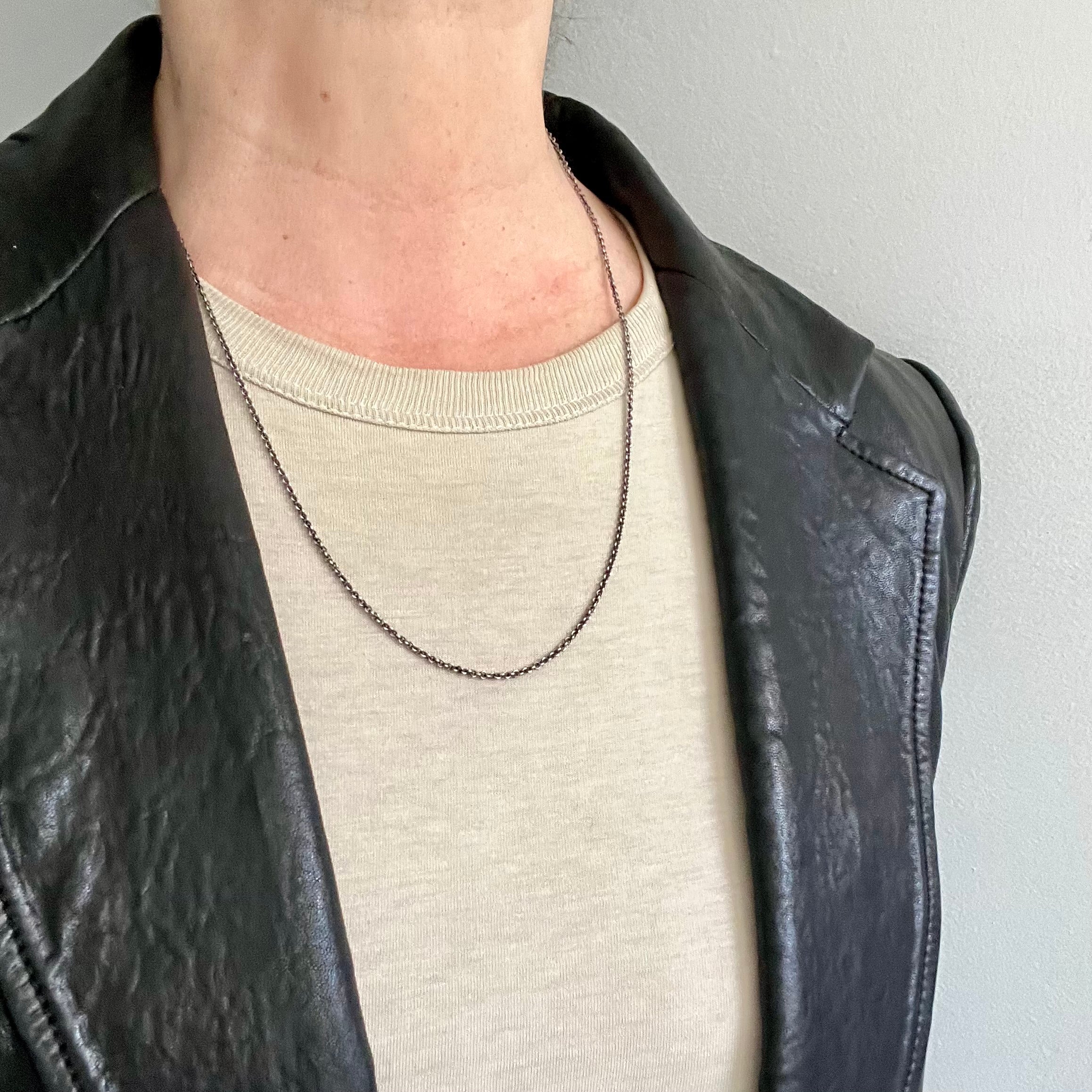 This classic cable chain with a minimal design won't overpower the amulets or tags you choose to hang on it. Its oxidized finish adds edge and attitude. The chain closes with a lobster lock clasp and our K-rose logo end tag.