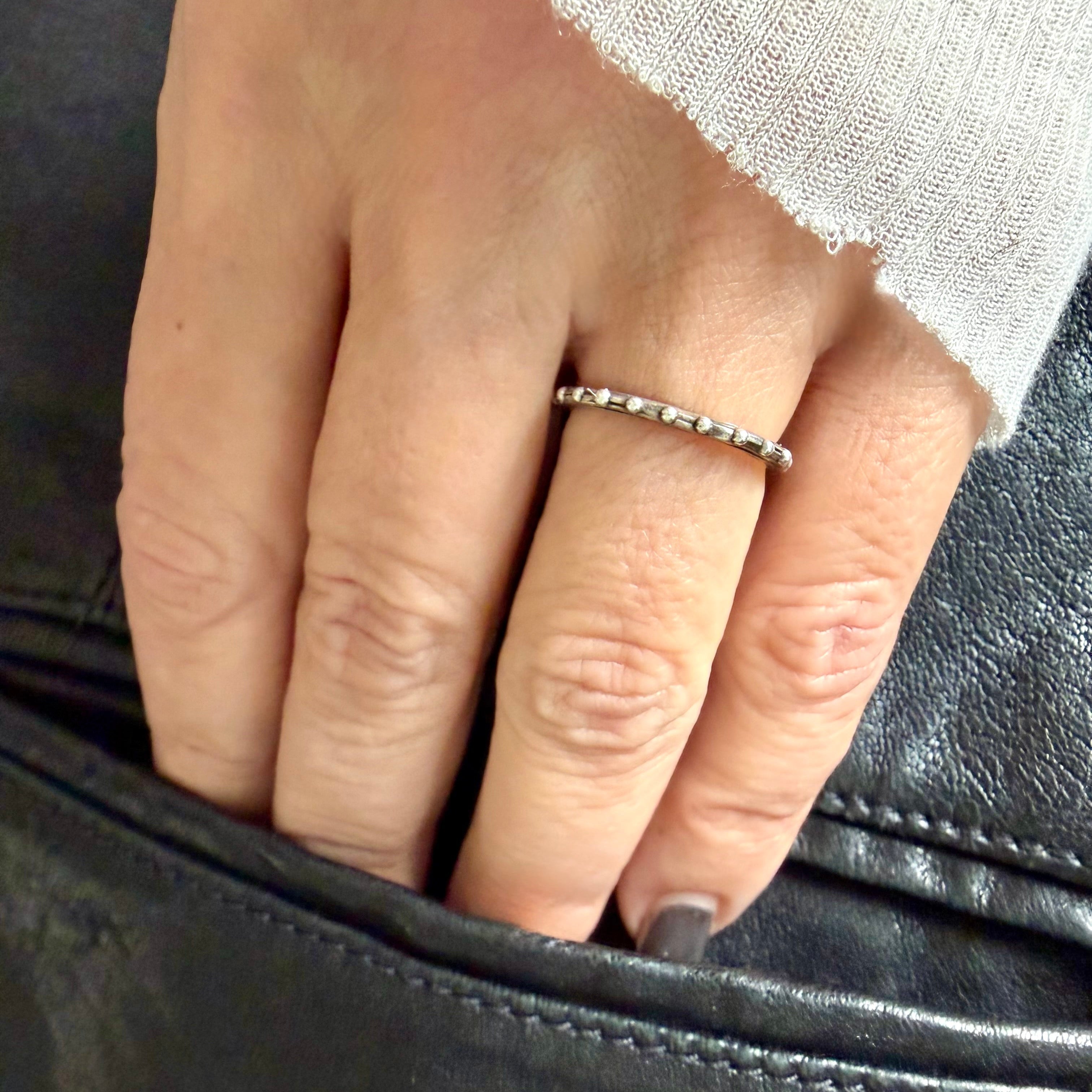 Our Evermore band in weathered metal and uneven edges was elevated with a repeating ball detail. This essential stacking ring pairs perfectly with most rings in our collection.
