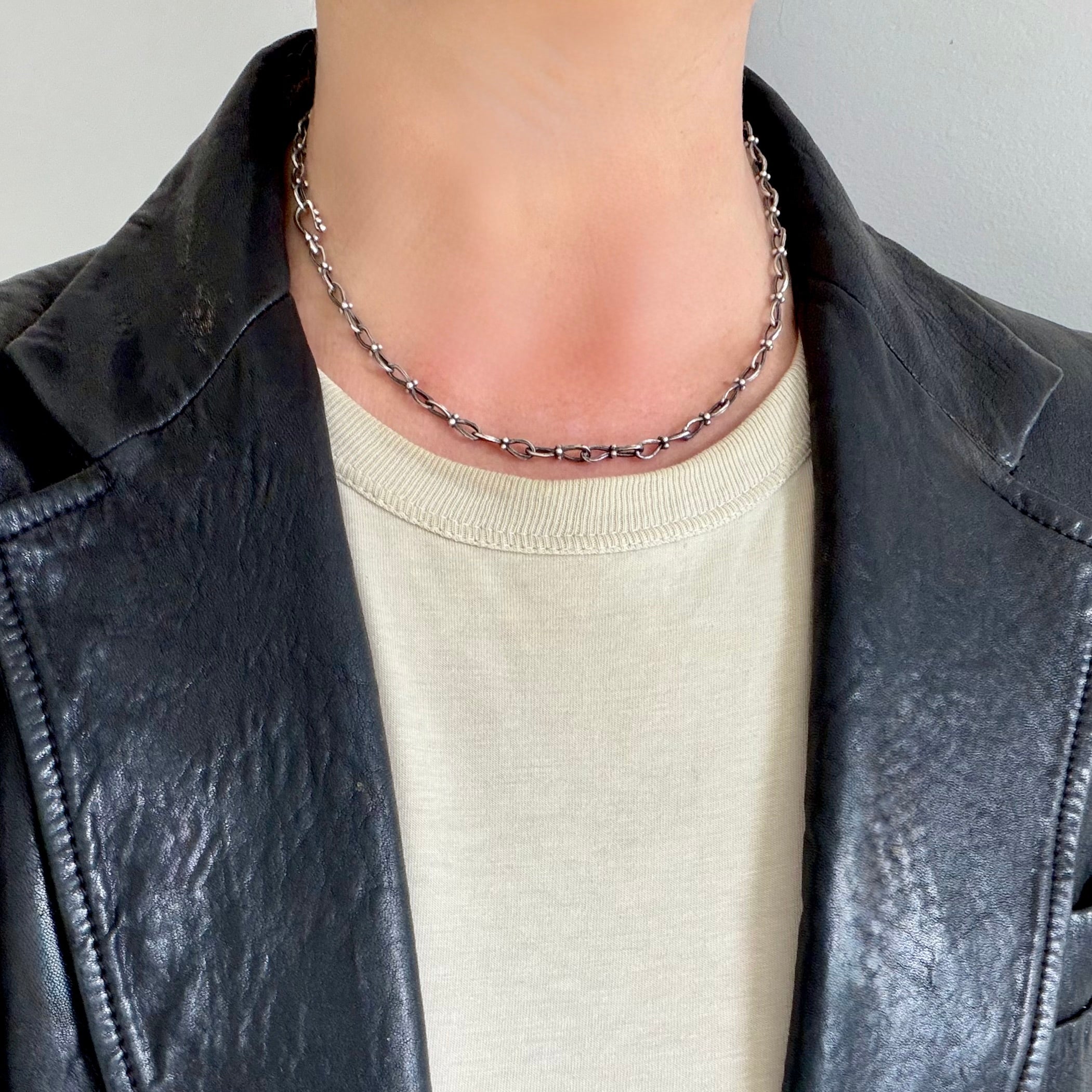 Inspired by our journey to India, this stylish handcrafted chain made of infinity shape links detailed with 4 balls center. Lovely as a short necklace, or wrapped around the wrist twice and stacked with bangles.