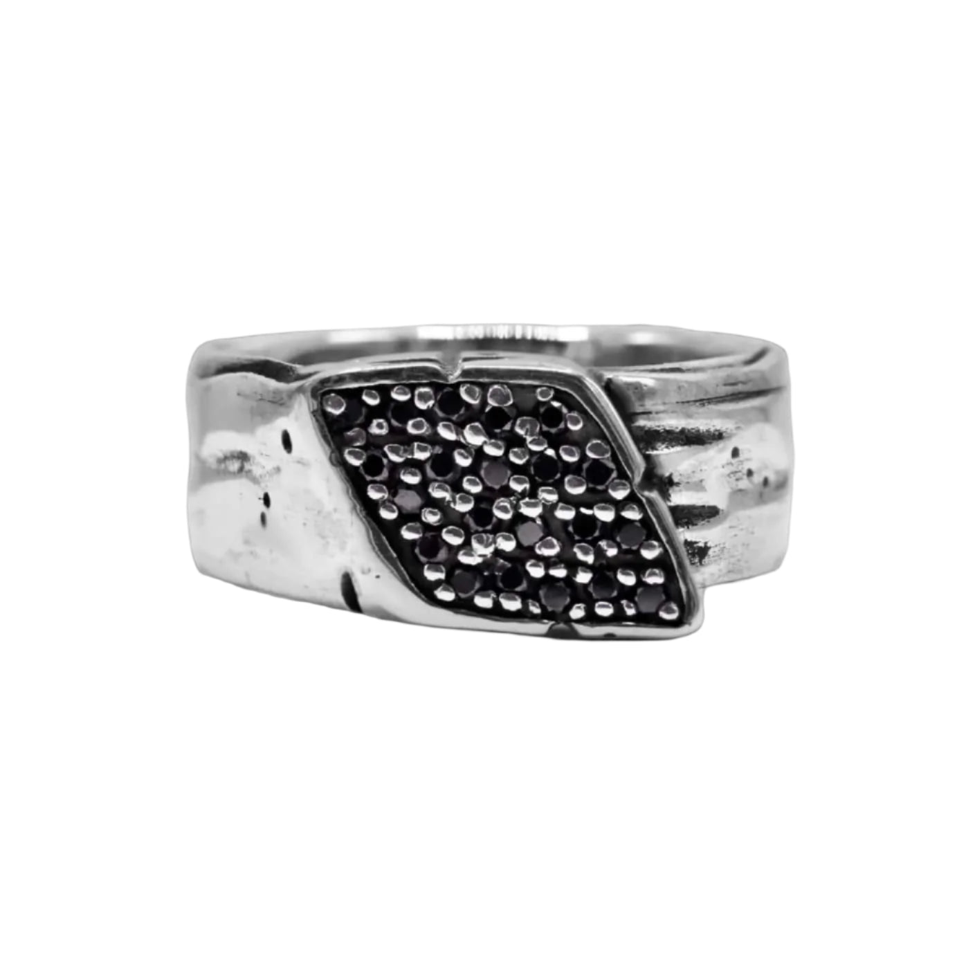 A chunky, weathered silver band wraps the finger in an asymmetrical design, featuring a centerpiece studded with black diamonds. This ring wass designed to be worn alone or stacked with other rings for a personalized style.