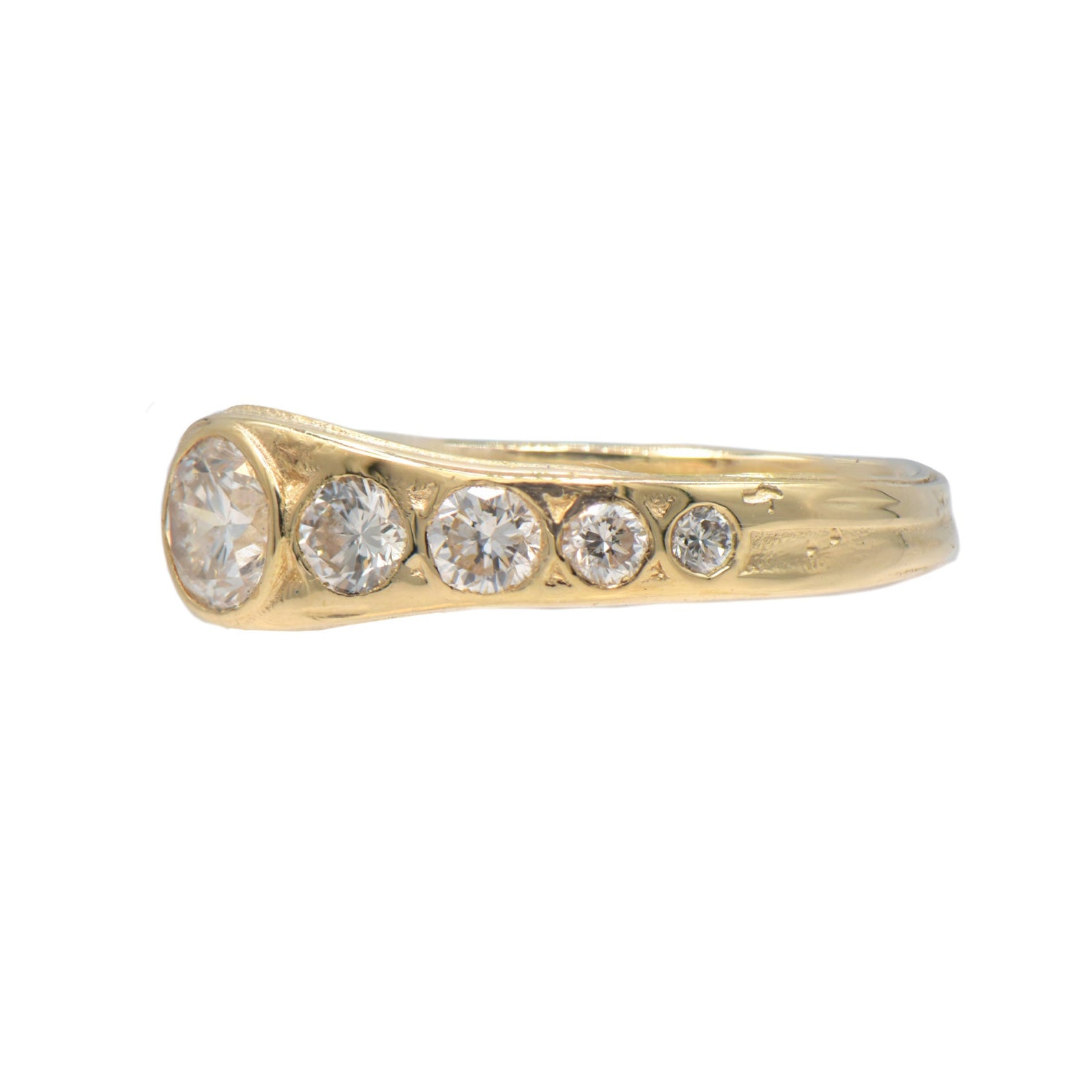 CLIENT REQUEST: Remove diamonds from an inherited family ring to create a yellow gold half eternity with the diamonds "sunken into the band" to stack with another custom ring, a wide platinum diamond tiara style ring. (see "before" image)