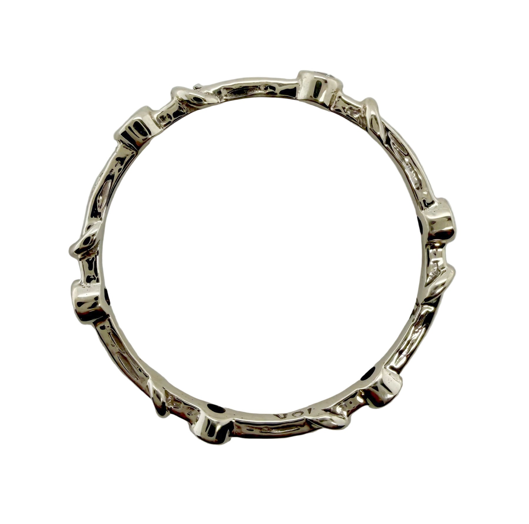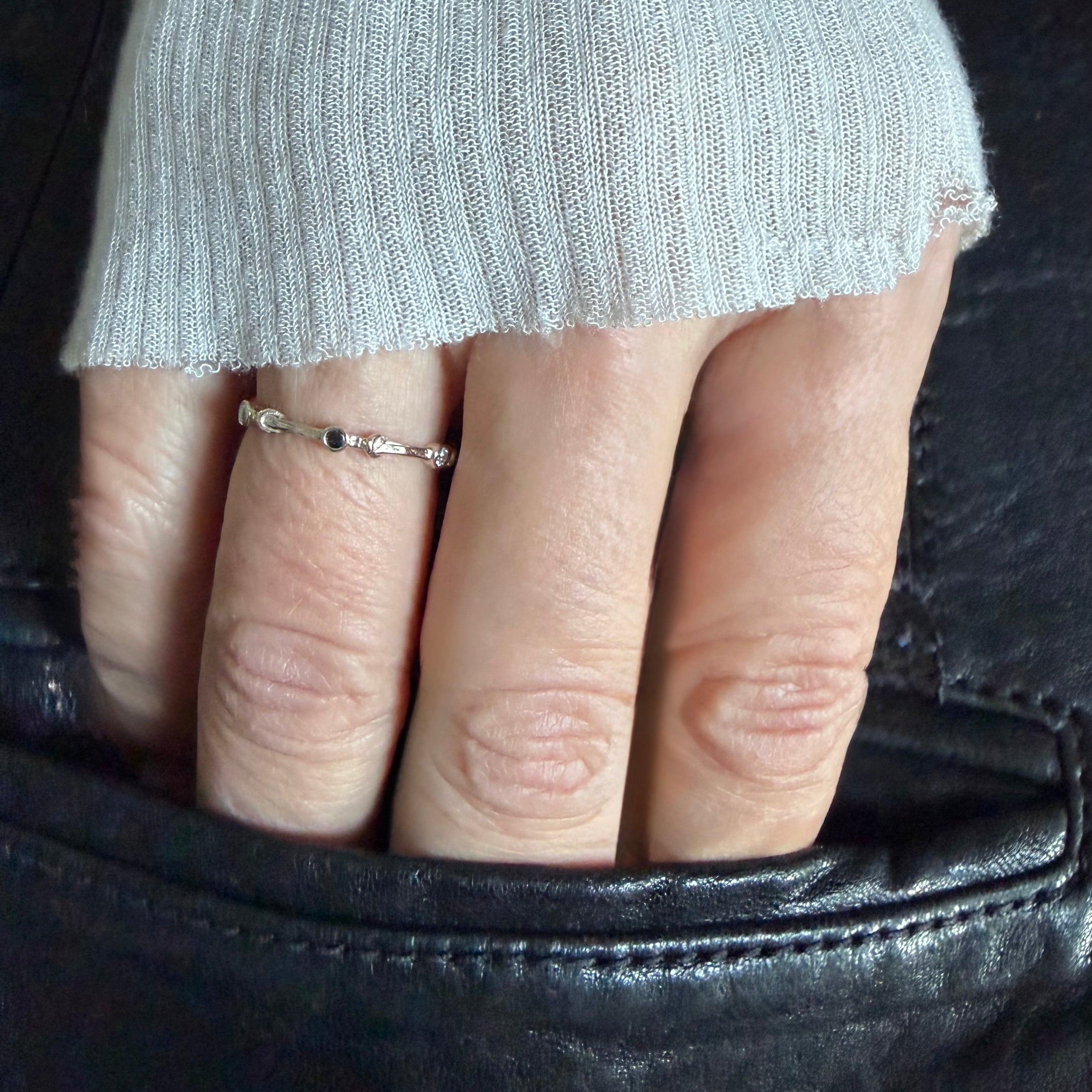 This slender organic band features six bezel-set diamonds, alternating black with white and colorless, evenly spaced and detailed with a crossing vine motifs. Vines symbolize connection and determination, qualities necessary to keep focused on true love.
