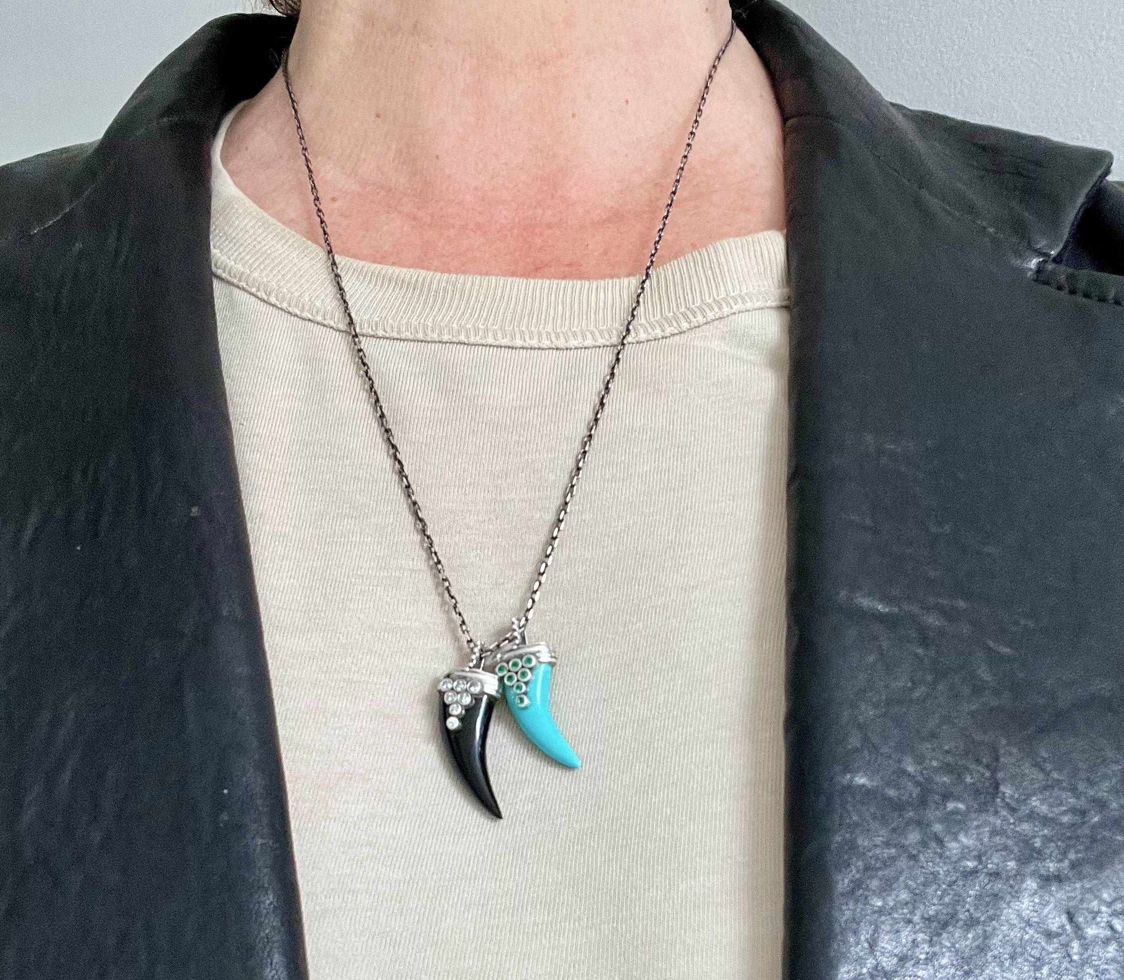Crafted to attract good luck and prosperity, the horn amulet is one of our most sought-after talisman pendant charms. A bail with repeat ball details connects to a weathered cap from which bezel-set gems elegantly cascade down the carved gemstone it holds.