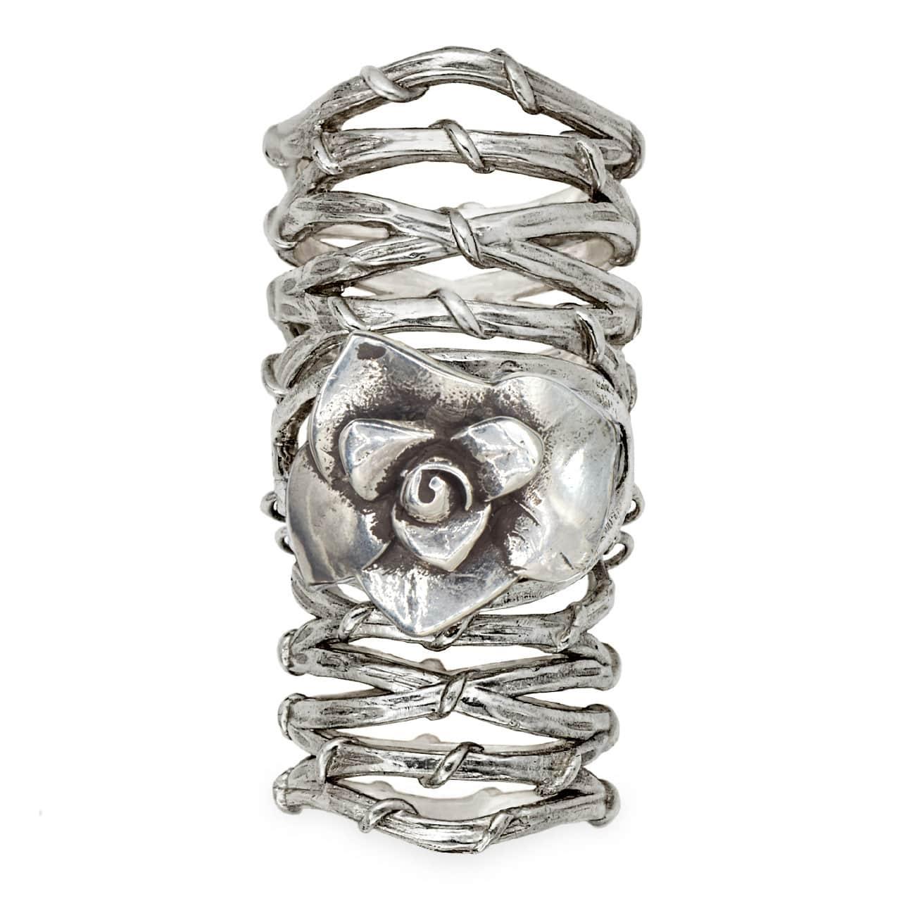 A cutting-edge statement ring that expertly fuses sophistication with formidable strength. A rosebud rests on the knuckle and centers two bands of intertwined vines that span the length-of-the-finger, adjusting effortlessly to your movements.