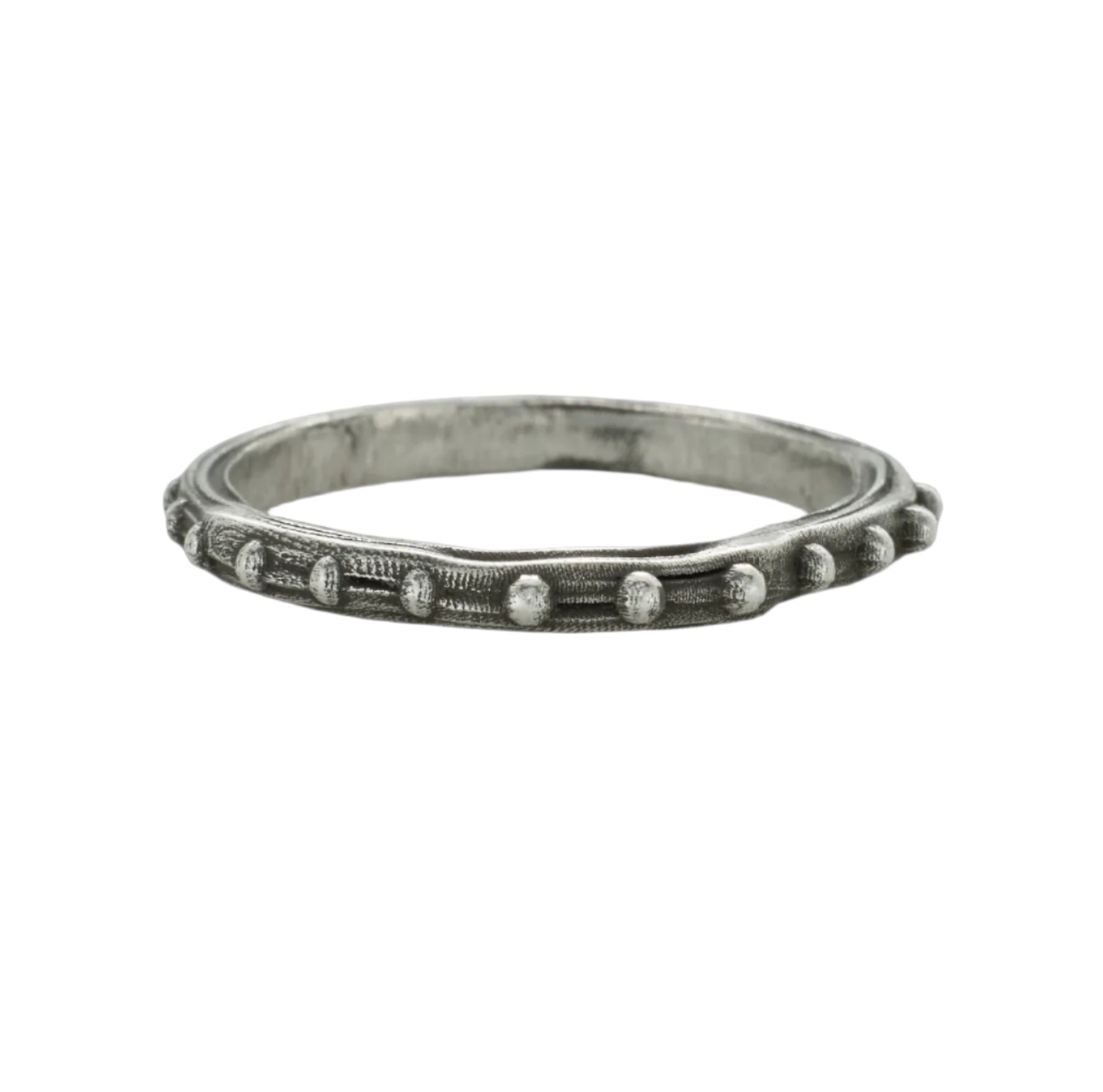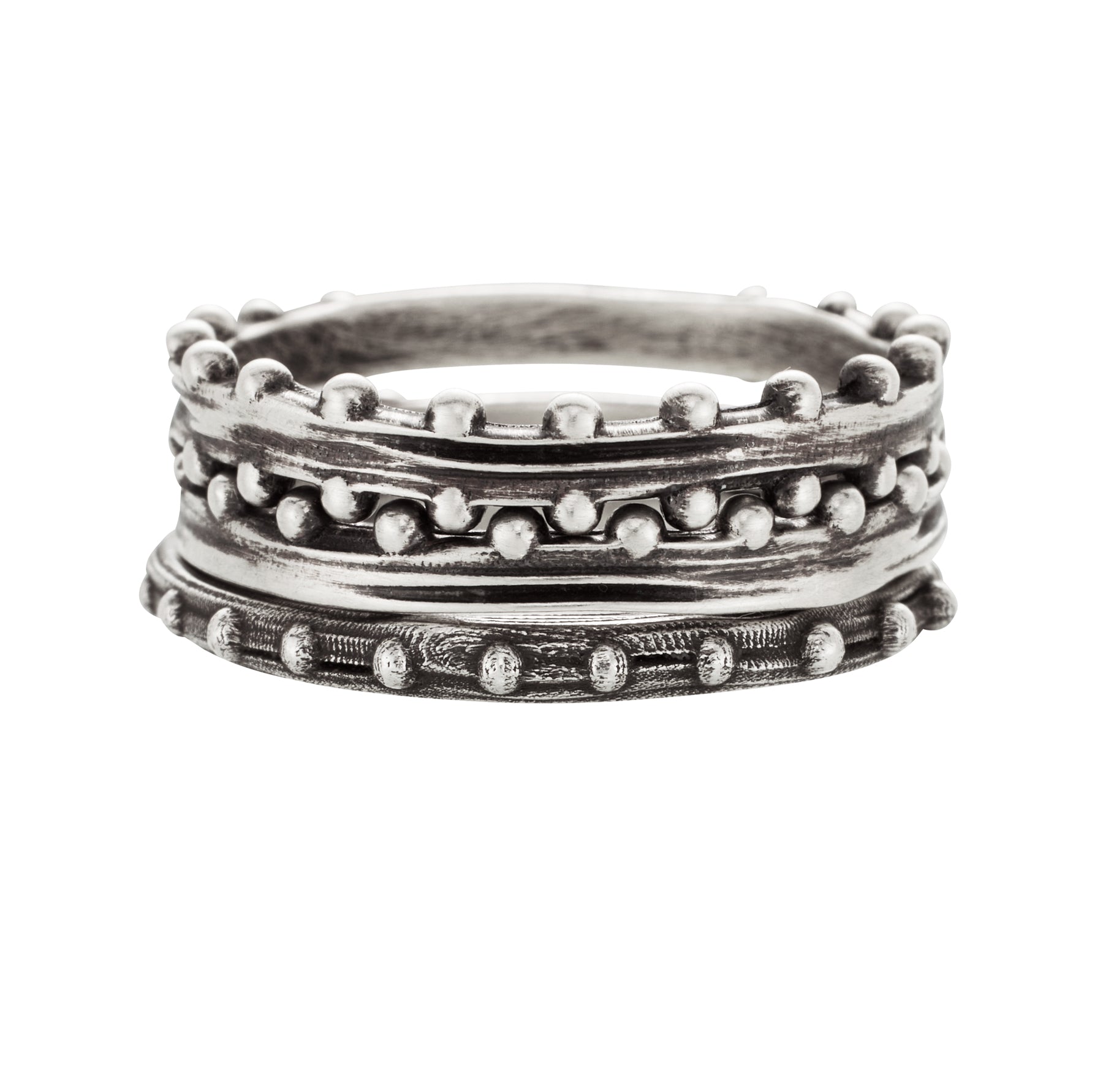 Repeating ball details adorn the weathered texture metal of these three silver bands, allowing them to interlock and stack as a three ring set. Each ring is unique, one has ball details on both sides, another is adorned on only one side, and the third, on the top.
