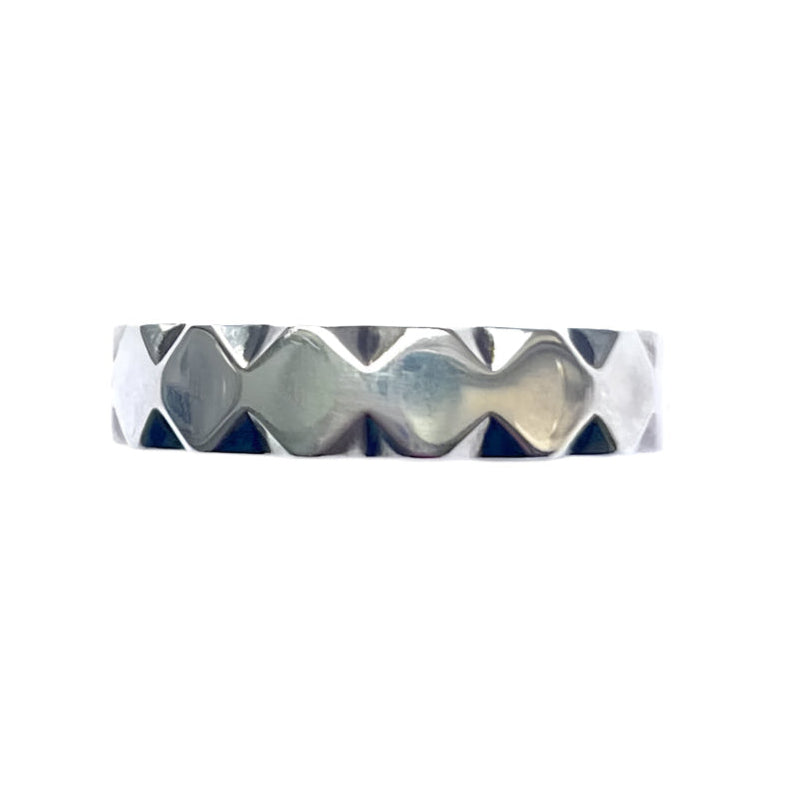 The Outshine, a reissue from our 90's design archives, is a 6mm wide band that balances polished refinement with a touch of punk. Featuring a repeated rounded angular pattern, this ring stands out whether worn solo or layered.