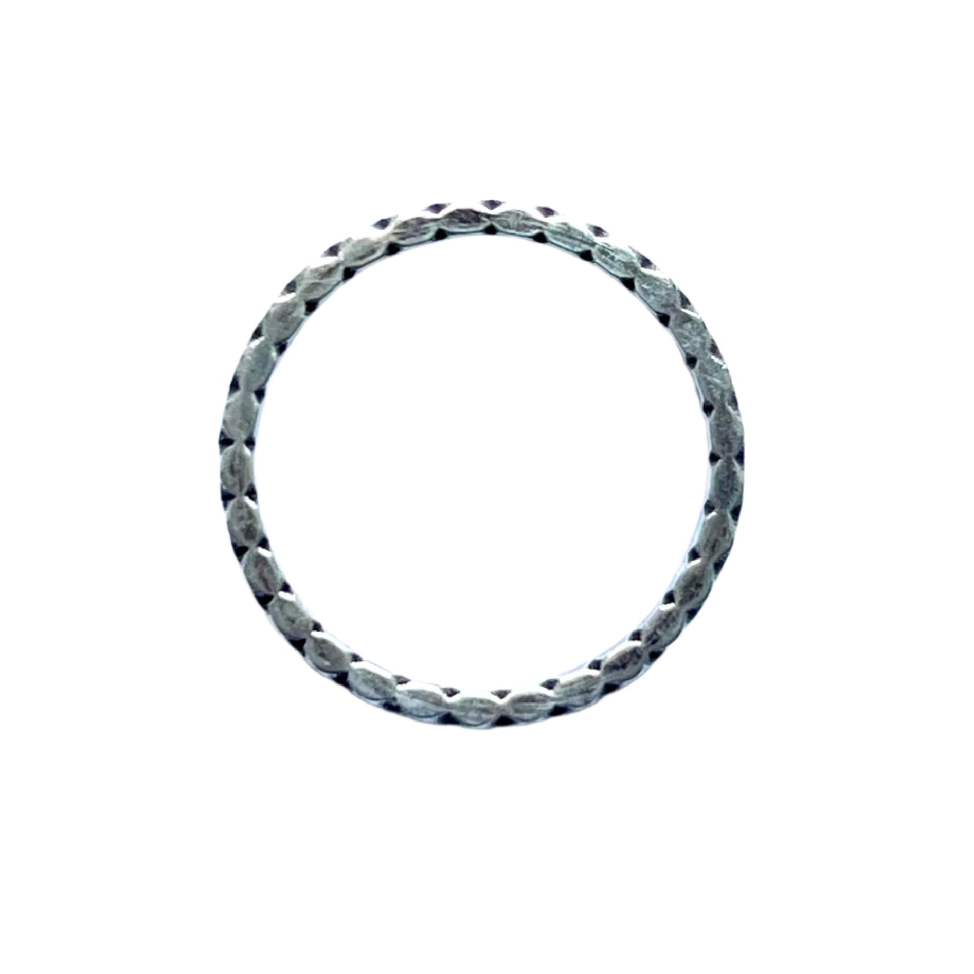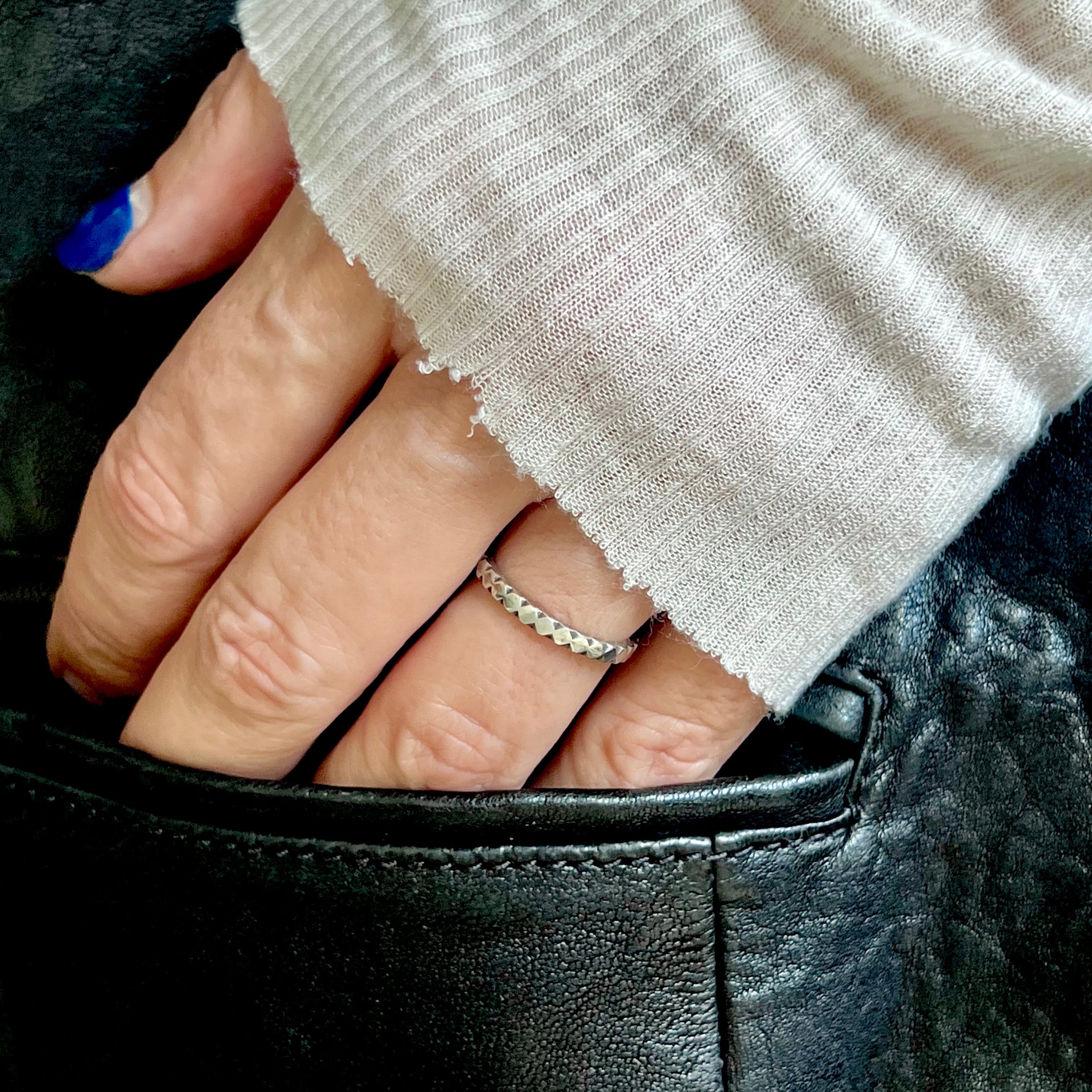 The Outshine, a reissue from our 90's design archives, is a 2.1 mm wide band with a repeating angular pattern softened by our weathered texture. balancing refinement with a touch of punk. Can be worn solo or stacked.