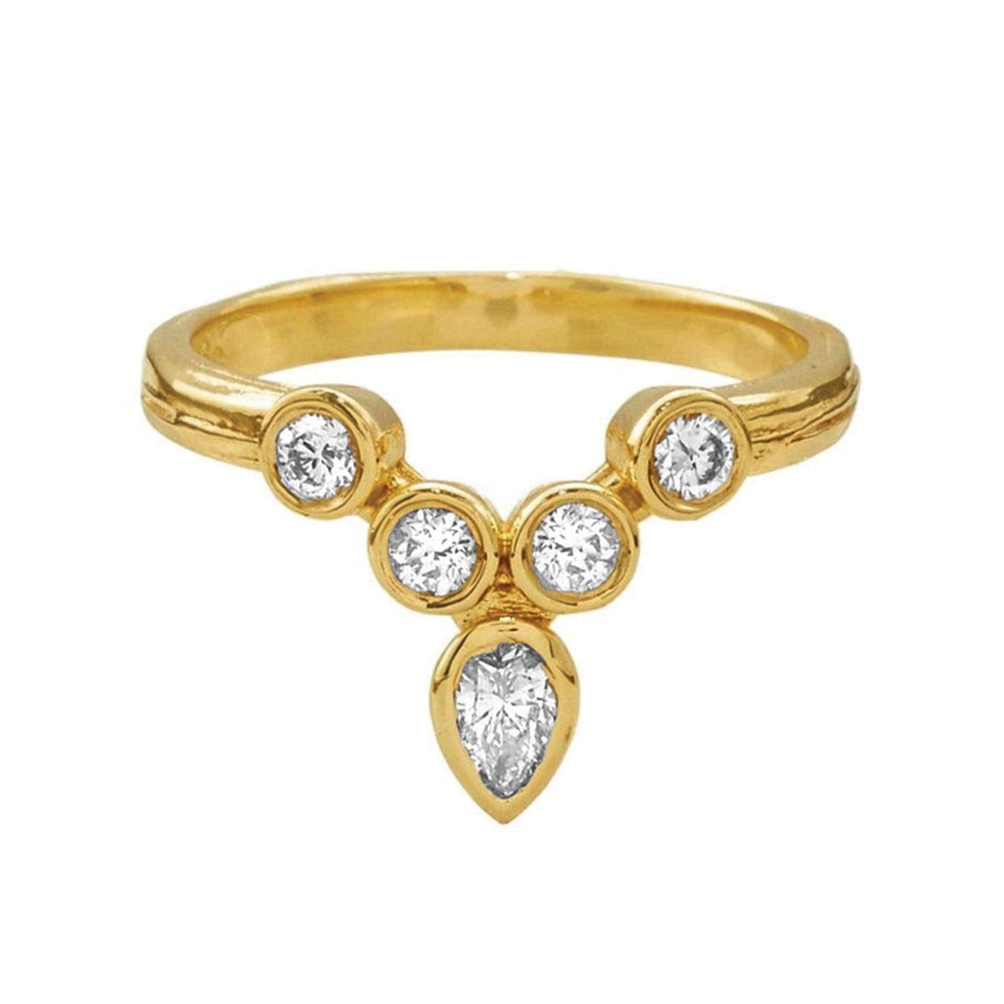 This simplified tiara ring showcases bezel-set 2.8mm diamonds arranged along a finger forming a "v" shape, completed with a single pear-shaped diamond that points outward. This weathered precious metal ring can be worn in either direction on the finger, alone or stacked with other rings from our collections.